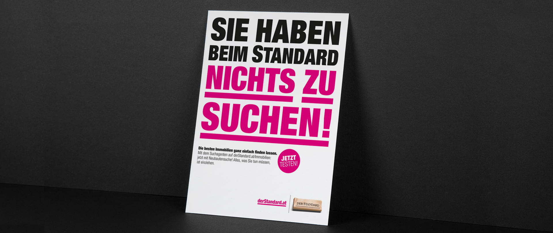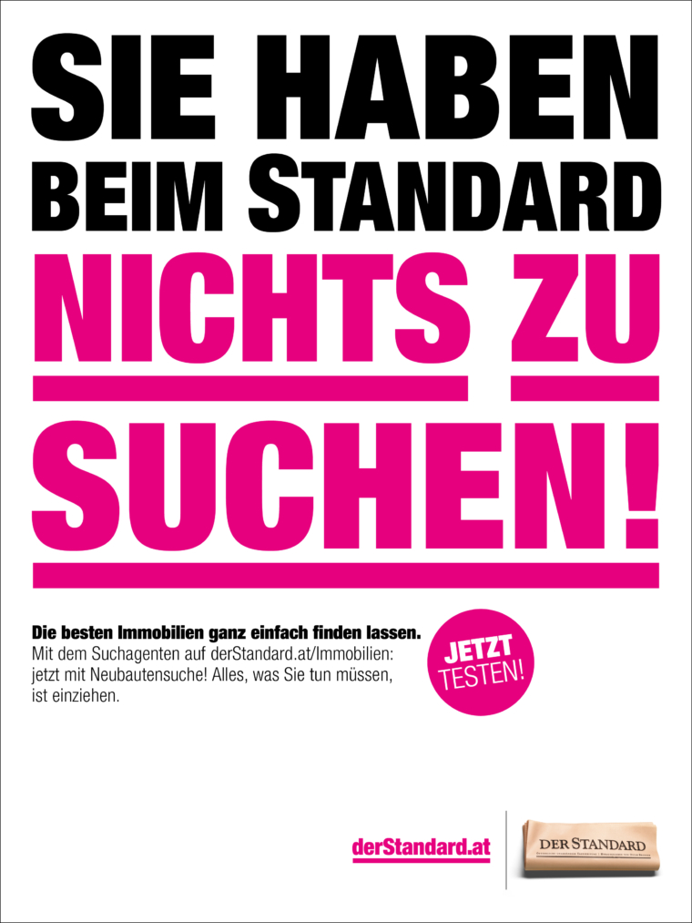 Sie haben beim STANDARD nichts zu suchen! Zumindest, wenn es um Immobilien und Jobs geht. Genau das sagen wir auch in Bannern, auf Social Media und in Print Anzeigen – und machen mit einem Augenzwinkern auf die große Auswahl sowie den Suchagenten auf derStandard.at aufmerksam.