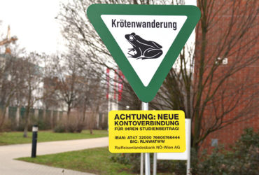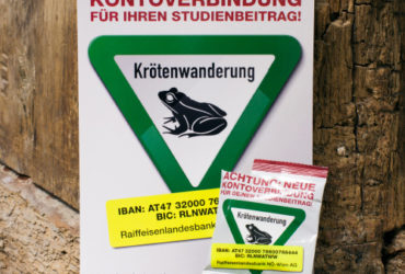 Eine Kampagne im Auftrag der VetMed, die darauf hinweist, dass die Kröten für den Studienbeitrag auf ein anderes Konto wandern sollen.