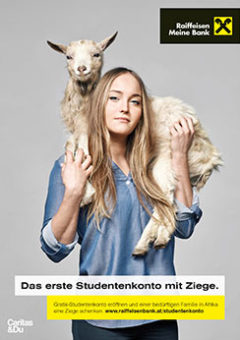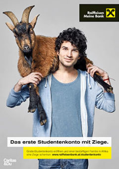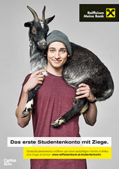 Für Studenten, die sich für ein Konto bei der Raiffeisenlandesbank NÖ-Wien entscheiden, gibt es ein besonderes Give-Away: Eine Ziege für eine bedürftige Familie in Afrika. Das macht Sinn, finden wir. Ein Projekt gemeinsam mit Caritas.